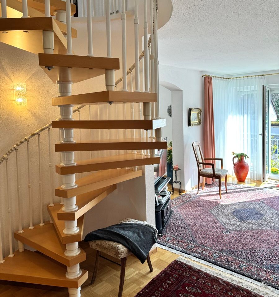 Die Wohnung erstreckt sich über zwei Ebenen und wird durch eine stilvolle Wendeltreppe miteinander verbunden. Dadurch entsteht ein offenes und besonderes Wohngefühl, das der Wohnung einen individuellen Charakter verleiht. Die gut durchdachte Raumaufteilung sorgt für eine praktische Nutzung der Wohnfläche und bietet viel Raum für persönliche Gestaltung.